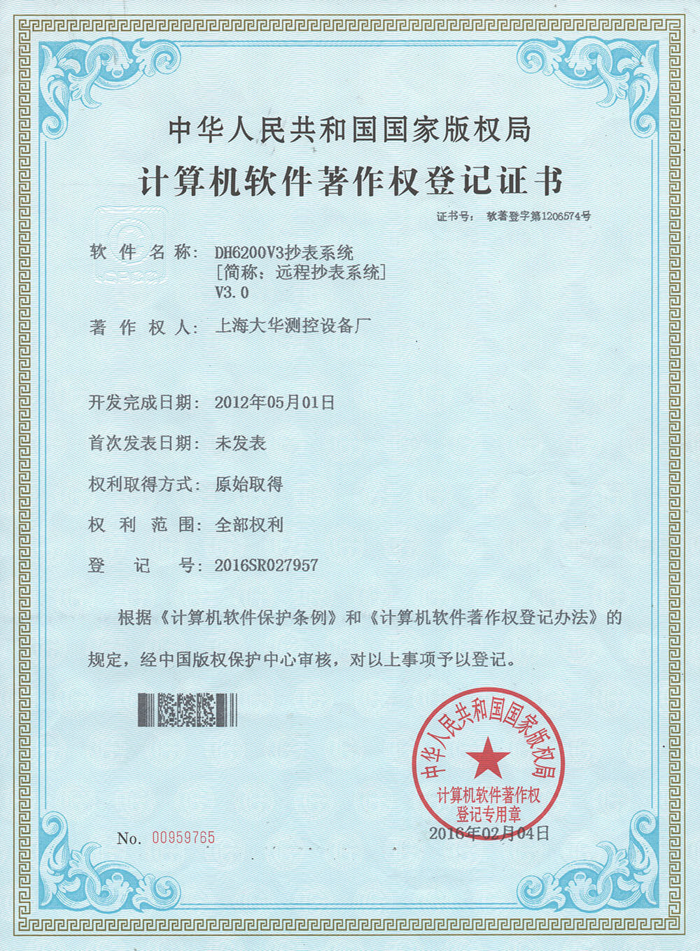 2016年2月 计算机软件著作登记证-DH6200V3抄表系统;